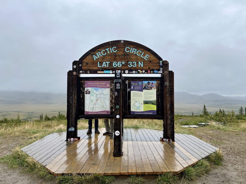 We departed Eagle Plains mid morning, and almost immediately it started raining. This made for slow cautious driving and hampered my picture taking. Twenty-one miles north we stopped at the Arctic Circle turnout, where I took picture evidence that we were actually there. If we look cold, that’s because it was, and we were. Oh, and our vehicles were working on achieving a new level of dirtiness.