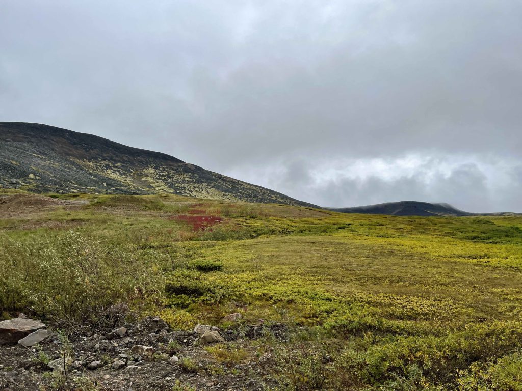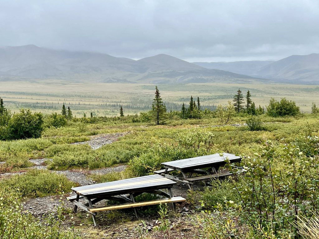At around 60 miles, and just before crossing the border between the Yukon and Northwest Territories, we summited Wright Pass at 3,000 feet, the third and last continental divide along the loop north. Before the Pass, we drove below cloud ceiling along the Richardson plateau and took what pictures we could. The views at the Pass may have been spectacular, but the low clouds and rain made it impossible to see much. Since the Arctic Circle, we also saw small color changes, which indicated the start of a short autumn season before winter arrived in mid-September.