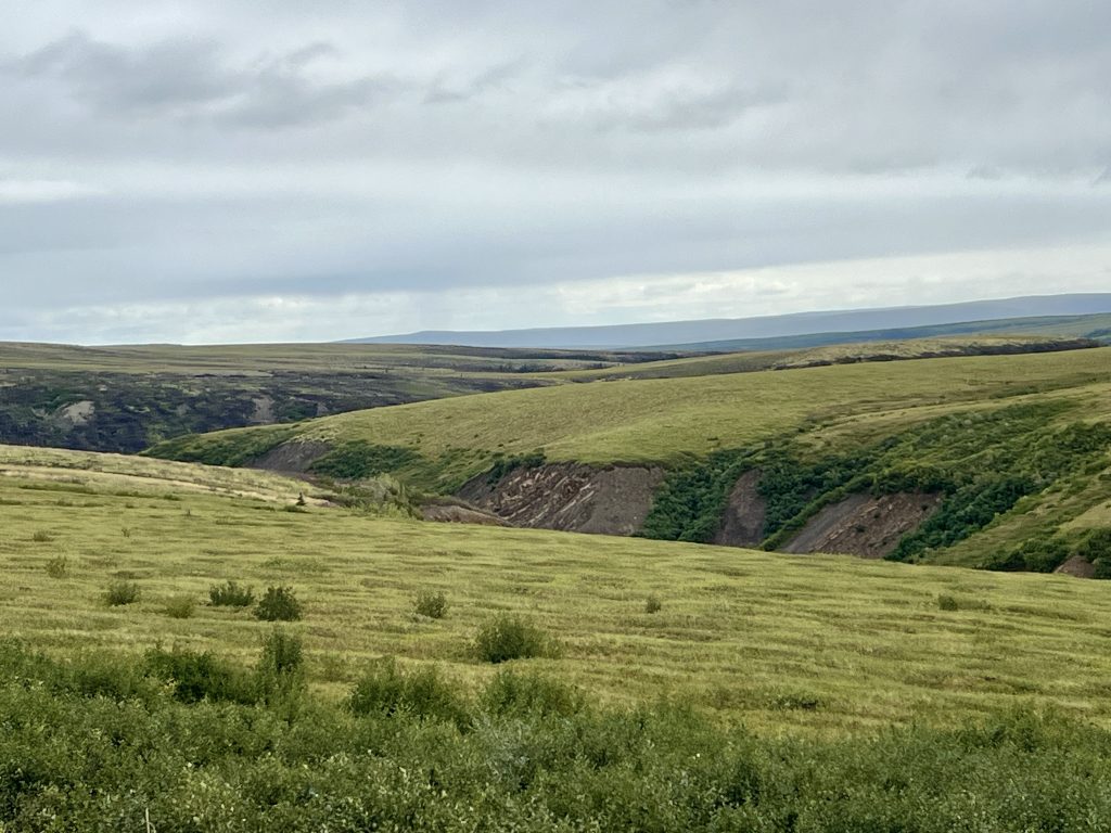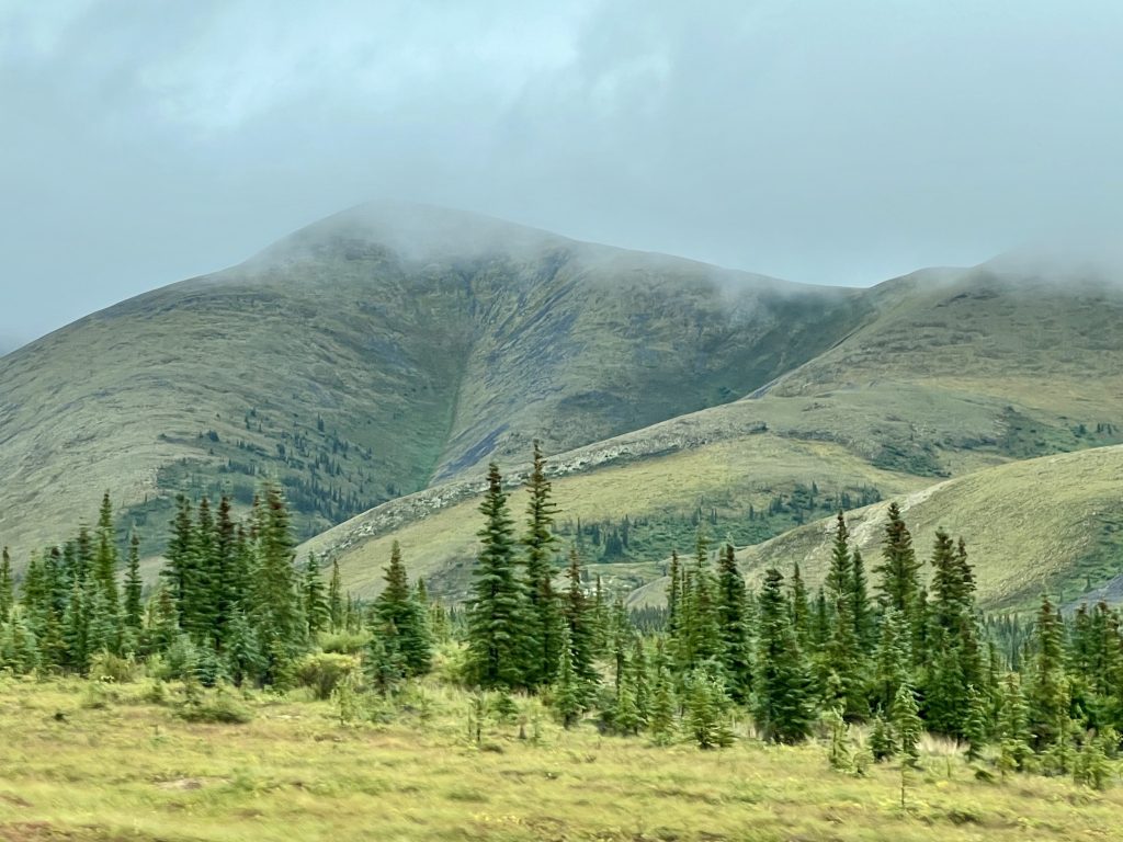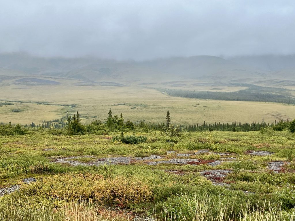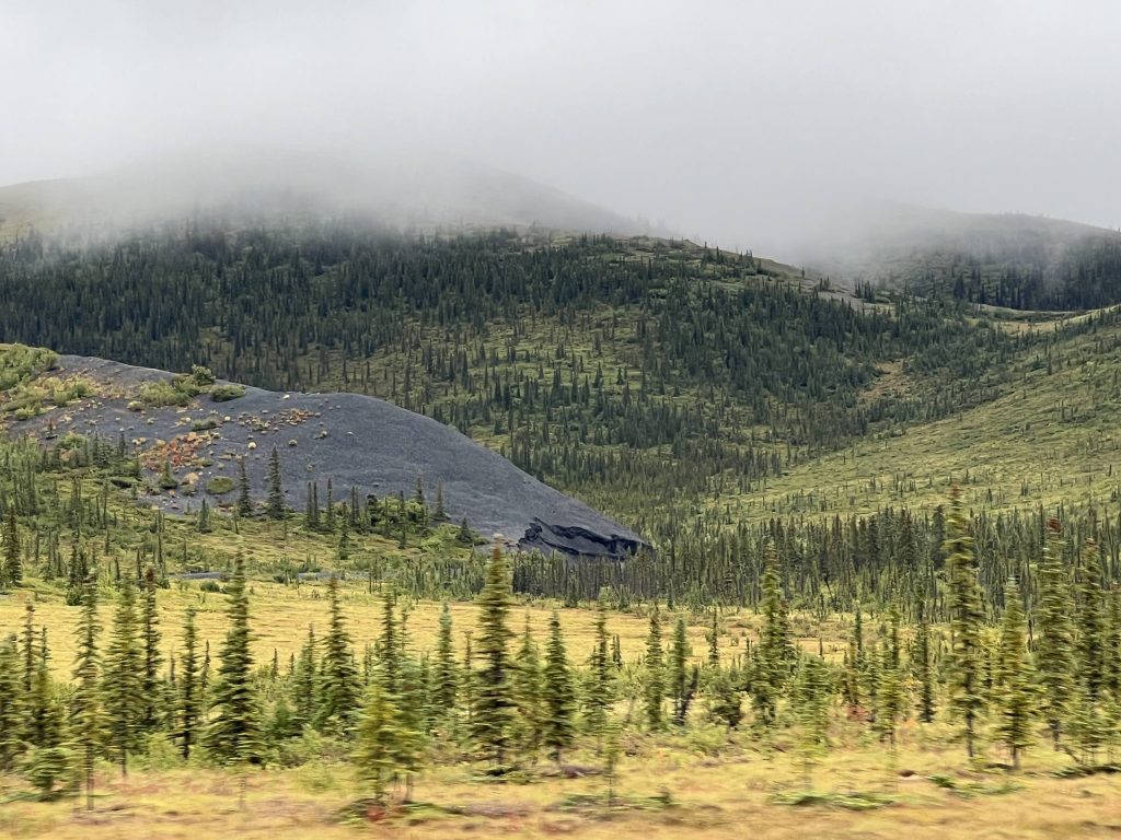 We paralleled the Richardson Mountains for about half the drive, and despite the rain and overcast skies, we saw some dramatic changes in terrain and vegetation. The unglaciated mountains were still rounded, but the trees went from small forests to occasional patches to vast tree-less permafrost plains.