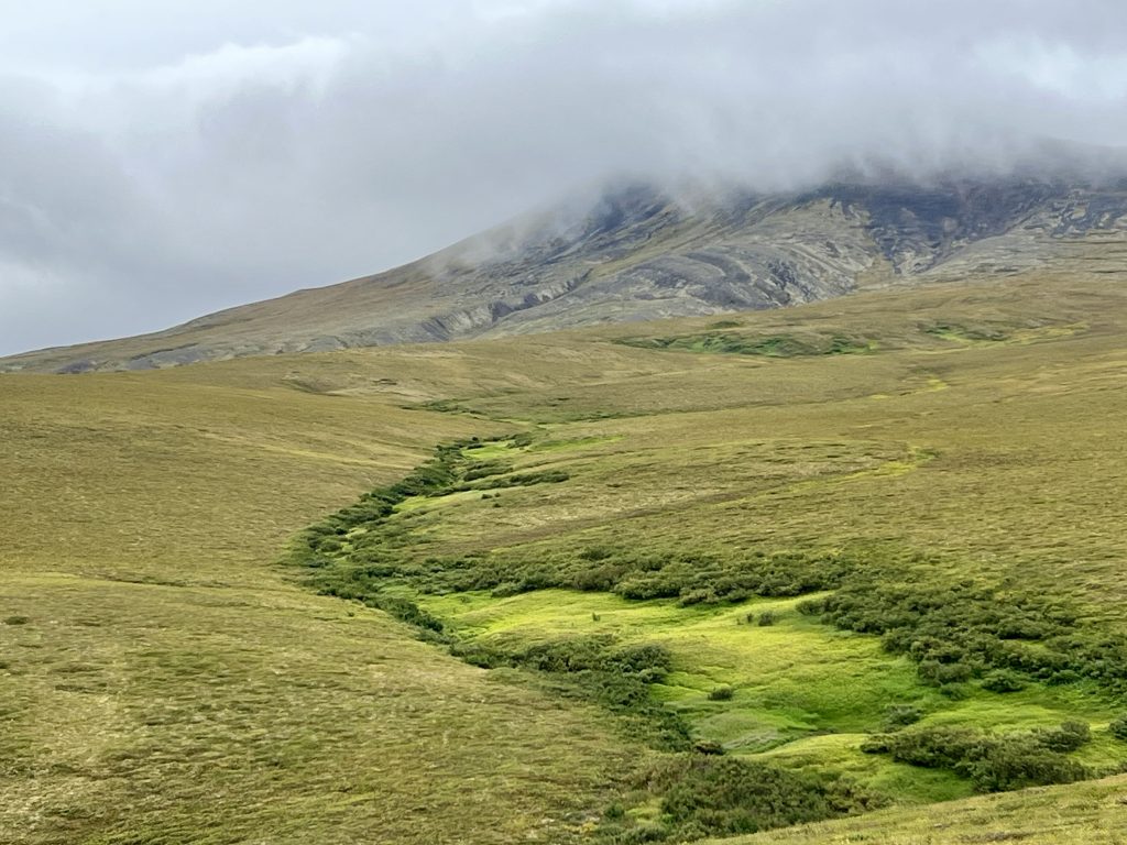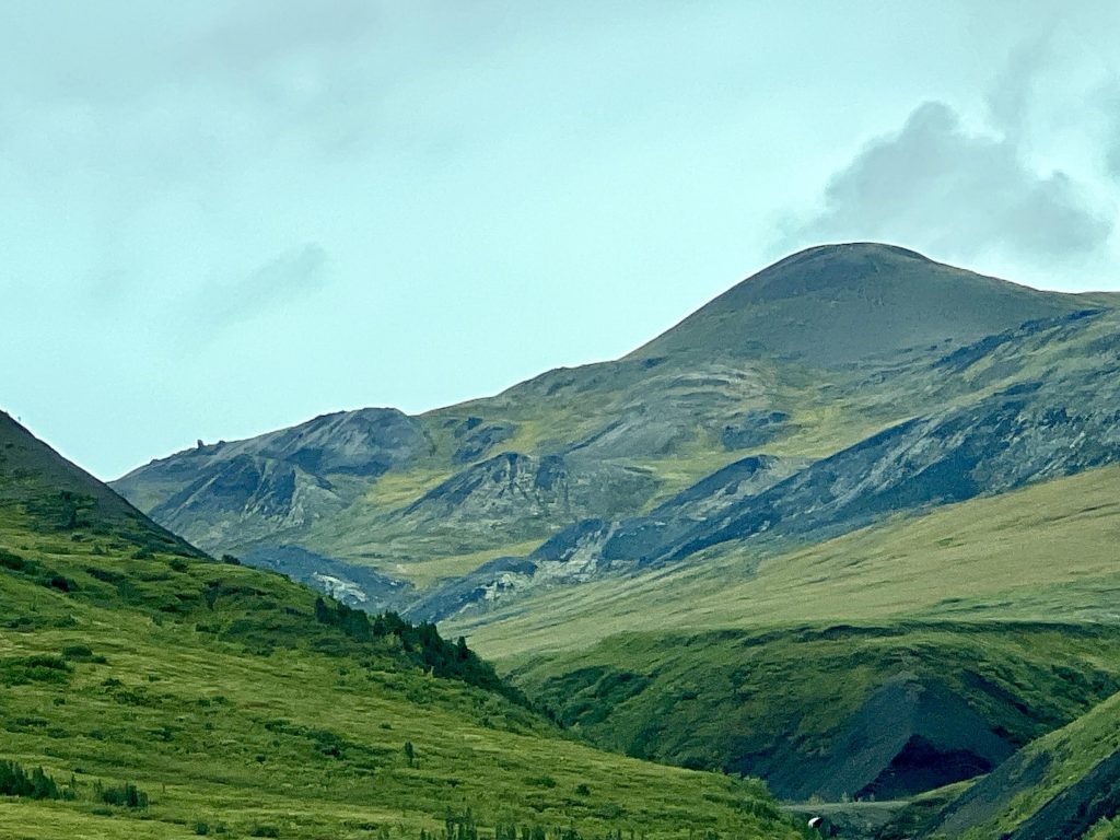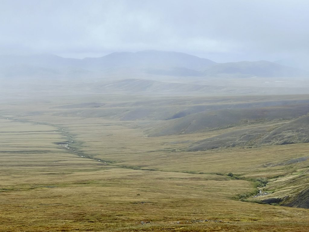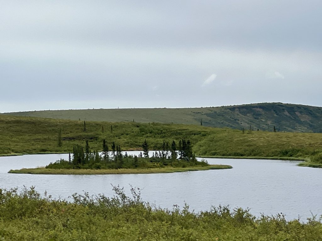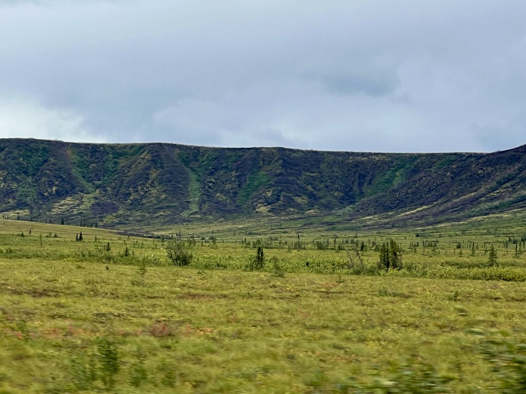 We paralleled the Richardson Mountains for about half the drive, and despite the rain and overcast skies, we saw some dramatic changes in terrain and vegetation. The unglaciated mountains were still rounded, but the trees went from small forests to occasional patches to vast tree-less permafrost plains.