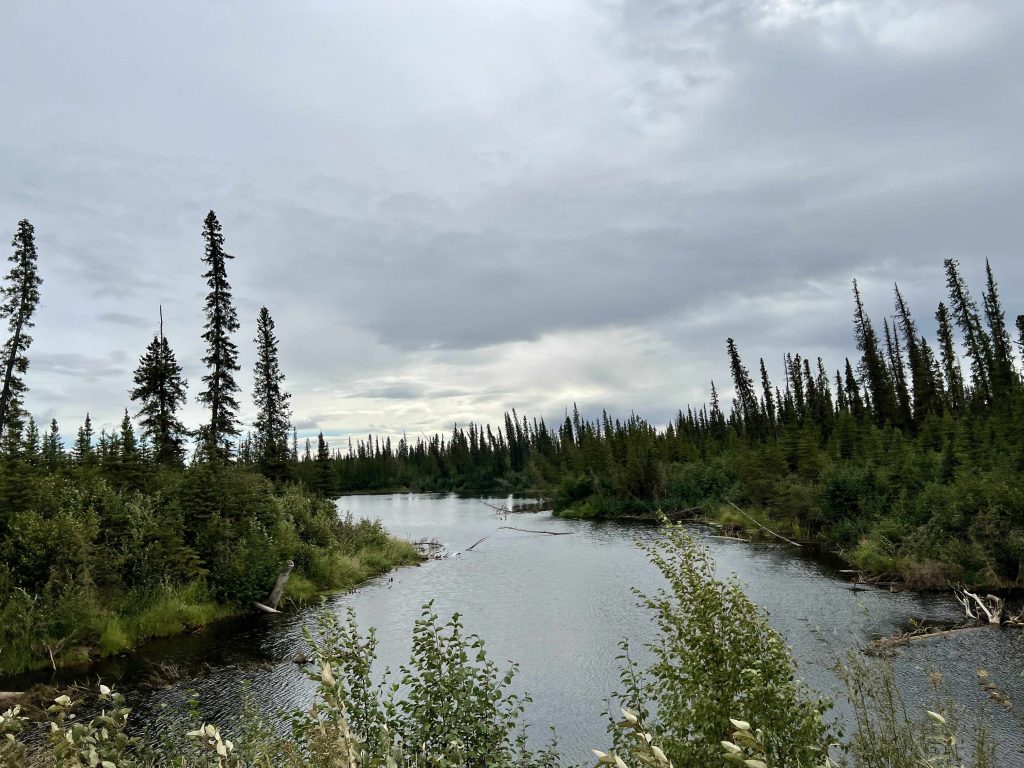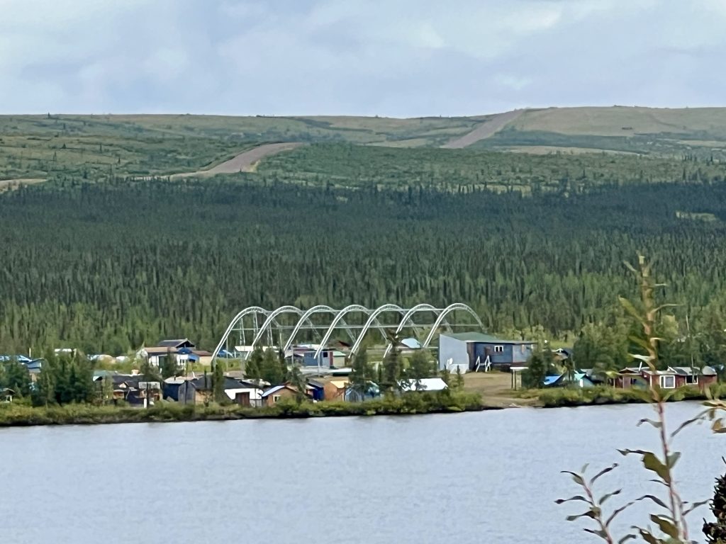 From Wright Pass, the Dempster decended 2,300 feet over a 31-mile stretch down to the Peel River. About halfway, we got a view of the Gwich’in village of Midway Lake (mostly a collection of First Peoles’ lake cottages). We learned too late, that they had just hosted their 37th annual Midway Lake Music Festival the 1st week in August. The Festival featured music (never any lyrics), drum dancing, and a new food bank charity, which provided all attending children with new backpacks stuffed with supplies.