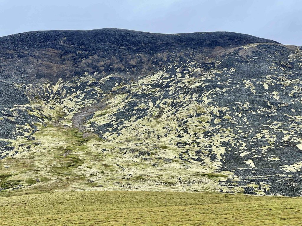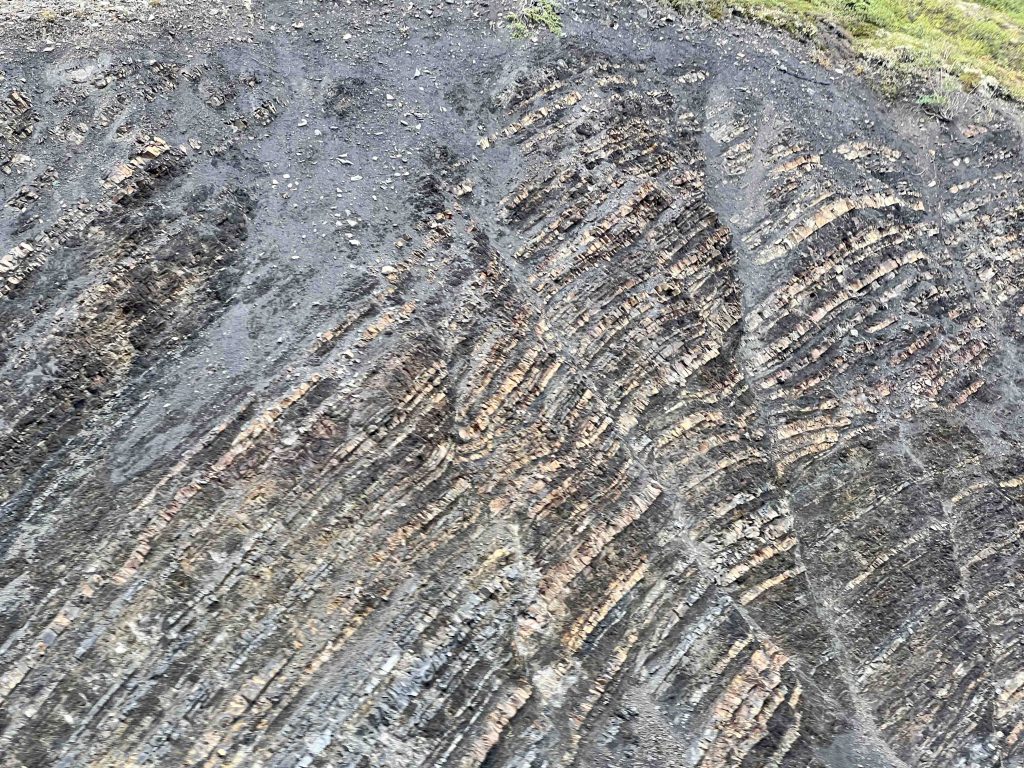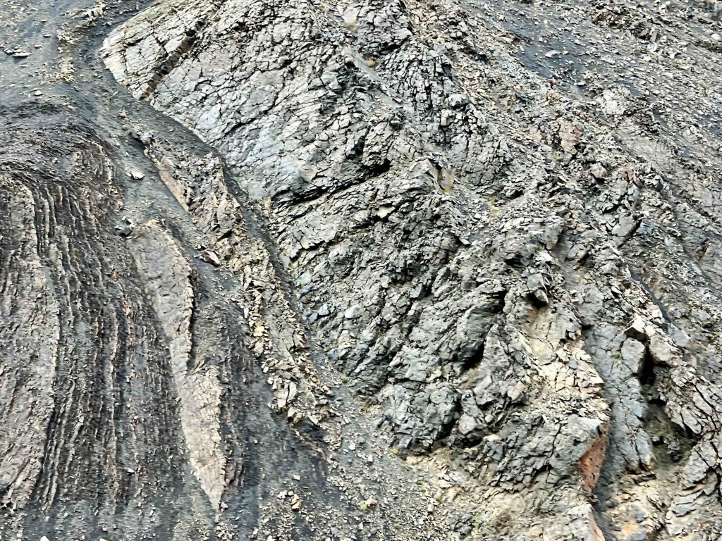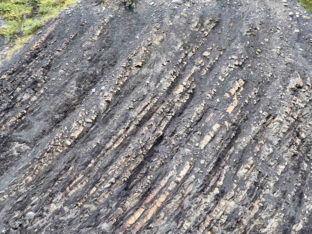 As we climbed up to the pass, the roadway cut through some interesting exposed sediments. BTW, even though MFI claimed in her Dempster Highway experience that there were no guardrails, I saw one here on our ascent to Wright Pass. It was completely mangled, hanging off the roadway, and snaking down toward the gorge below. Yikes! That must have been one incredible accident. In a turnout nearby, we saw the charred and twisted skeletal remains of two semi-trailers. Uncertain whether there was a connection.