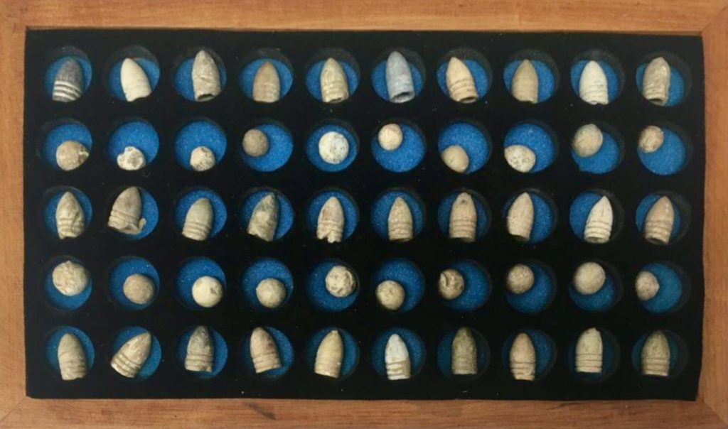 One of a number of bullet display boxes. Some bullets were intricate pieces of art carved by talented, bored soldiers.