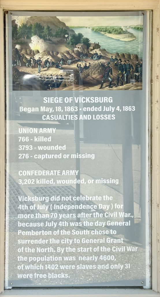 In our six years of life on the road, we’ve passed through Vicksburg, MS (population 26,407) probably a handful of times, but neither had nor took the time to stop and visit either the Vicksburg Civil War Museum or the Vicksburg National Military Park. But this time; on our return to Carrollton, TX from Hollywood, FL, we took 90 minutes and visited the Civil War Museum located downtown. The Military Park requires and deserves a minimum of a half-day.