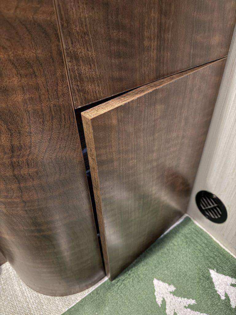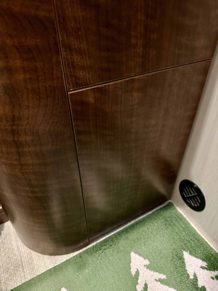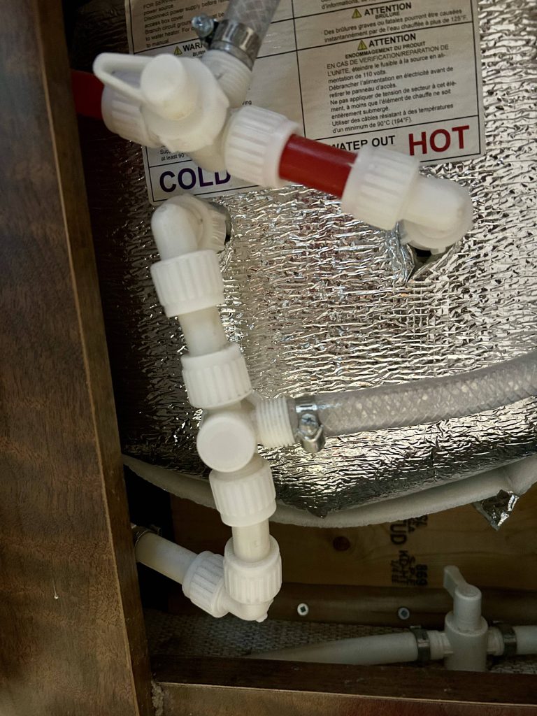 The backstory in summary. We were setting up our site at the Triple G Hideaway, Fort Nelson, BC, Canada on 15 June 2024. Our water heater had failed, and it was leaking badly. Couldn’t get it fixed or replaced locally, so MFI called Fraser RV, five stops ahead in Whitehorse, Yukon Territory, and arranged for an appointment. Their replacement work was highly successful; however, they didn’t have the appropriate plumbing parts, and the result was a truly ingenious yet nonetheless “rube-goldberg” piping arrangement that unfortunately didn’t allow our bathroom cabinet door to fully close. But…they did get us us back on the road quickly, we lived with the door being ajar, and I knew MFI could eventually replumb the connections and have the door closing again.