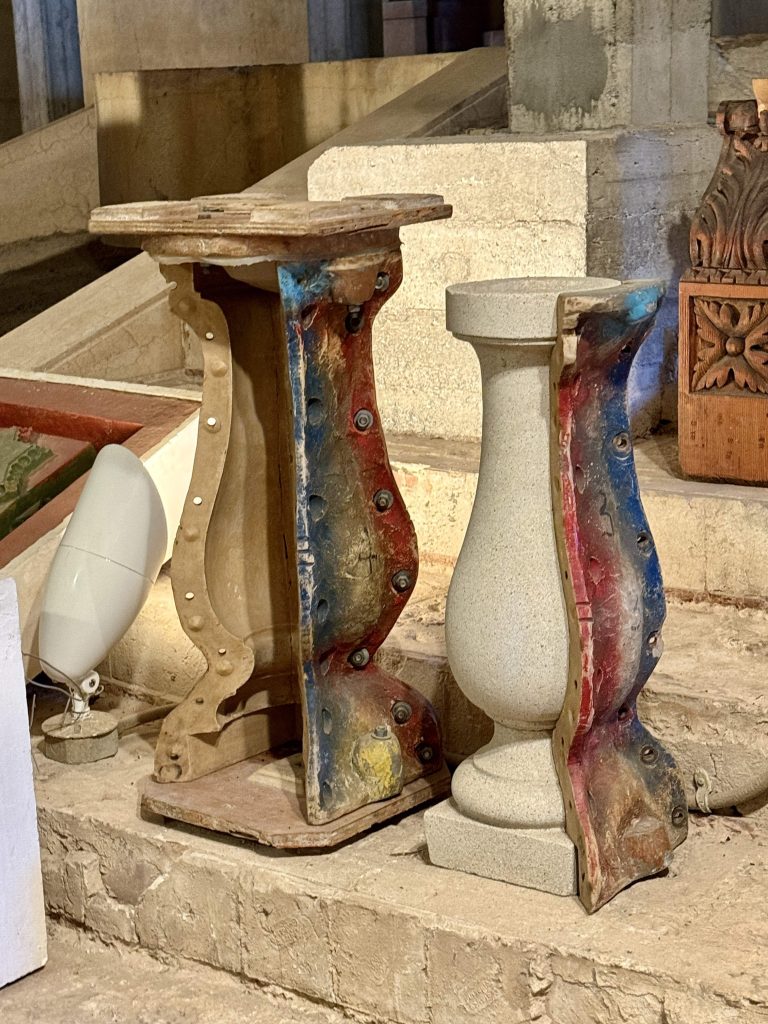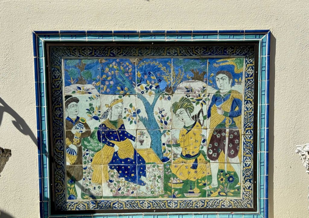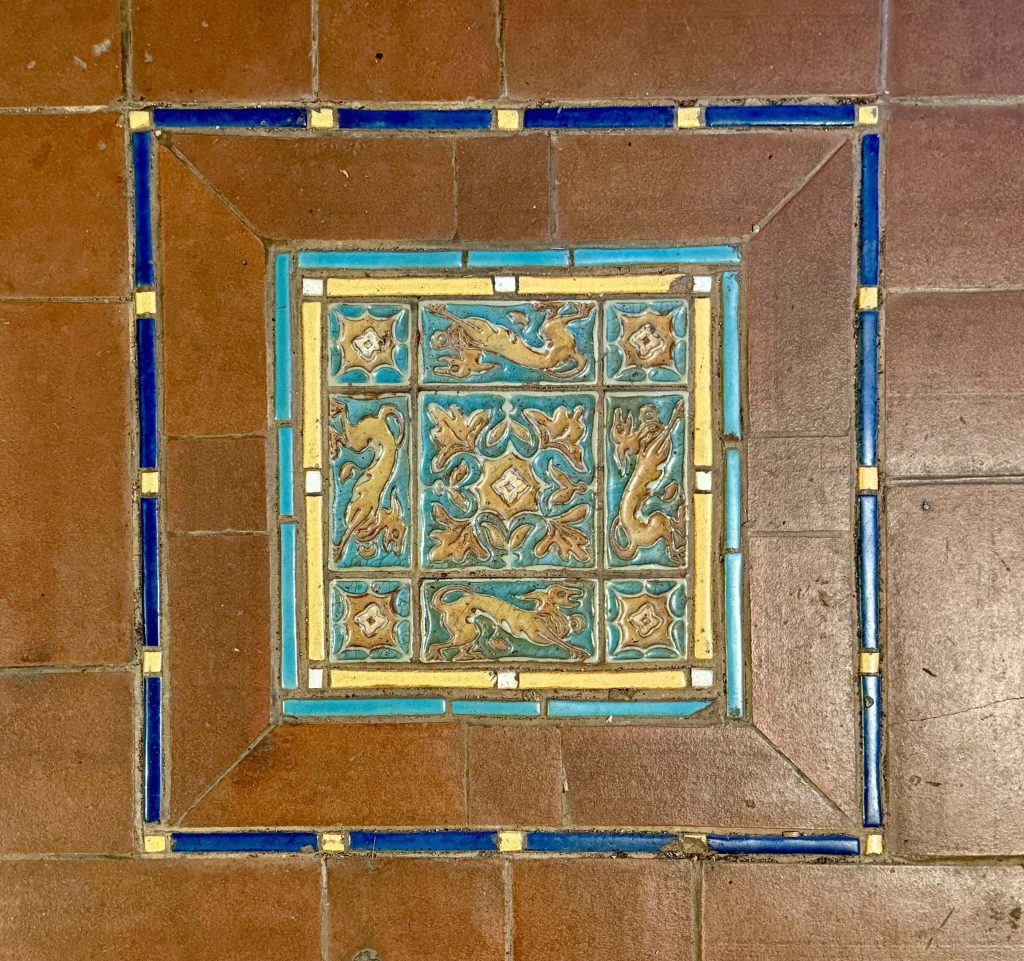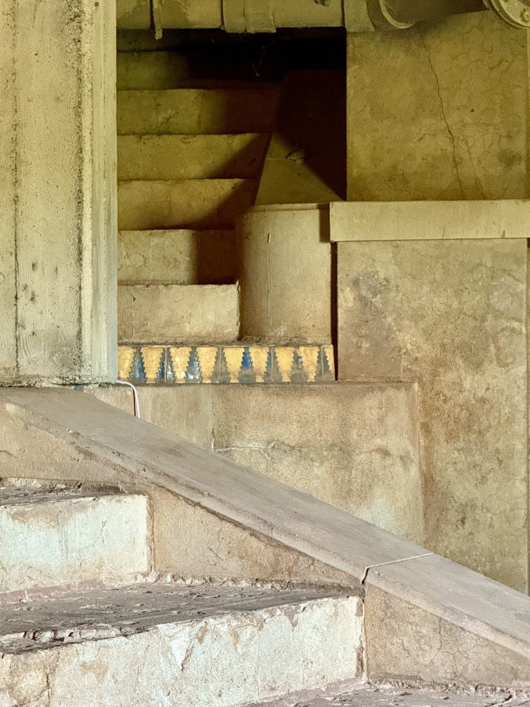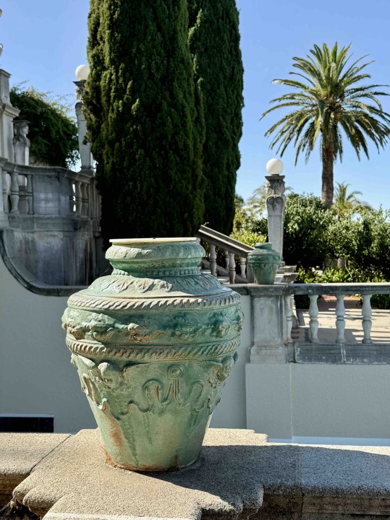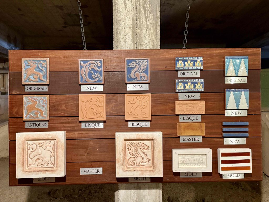 Stairs lead upward from the pool to the bathhouse, terraces, and three guest houses. Our docent claimed Hearst suffered from “terrace envy,” and this original North Terrace, now a subterranean area beneath today’s North Terrace, was set up to demonstrate for tourists the type of material and color boards used by Hearst and Morgan to help make design decisions.