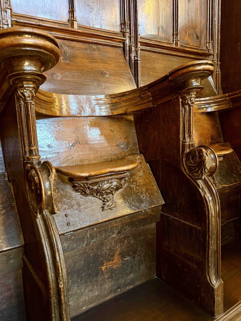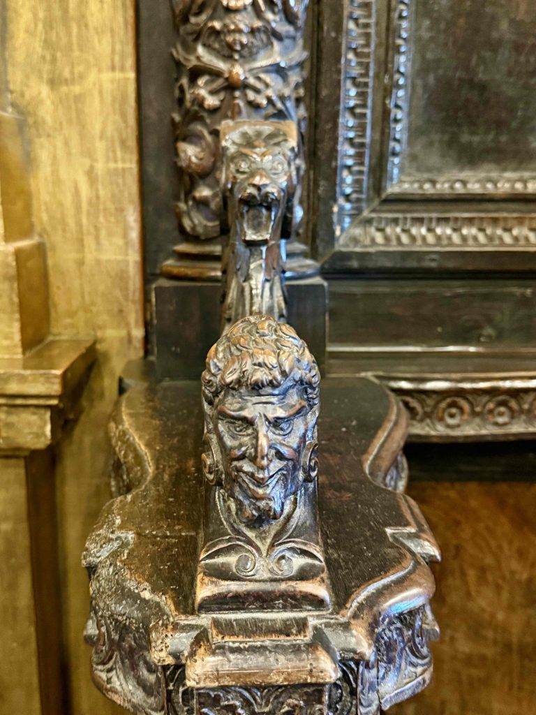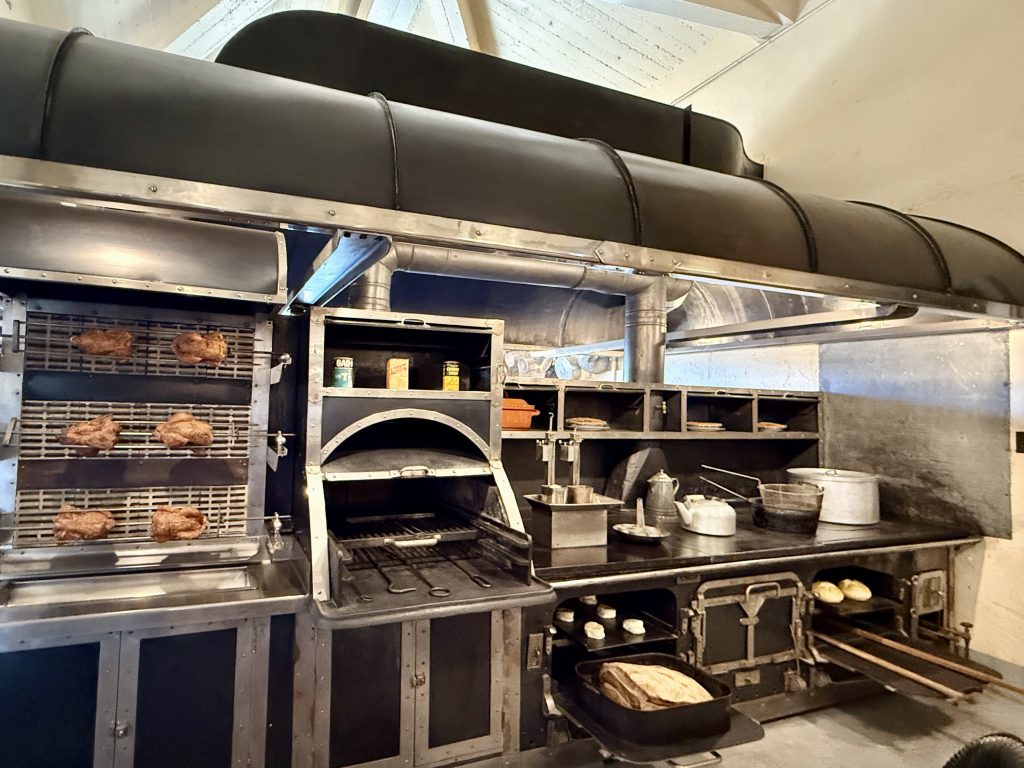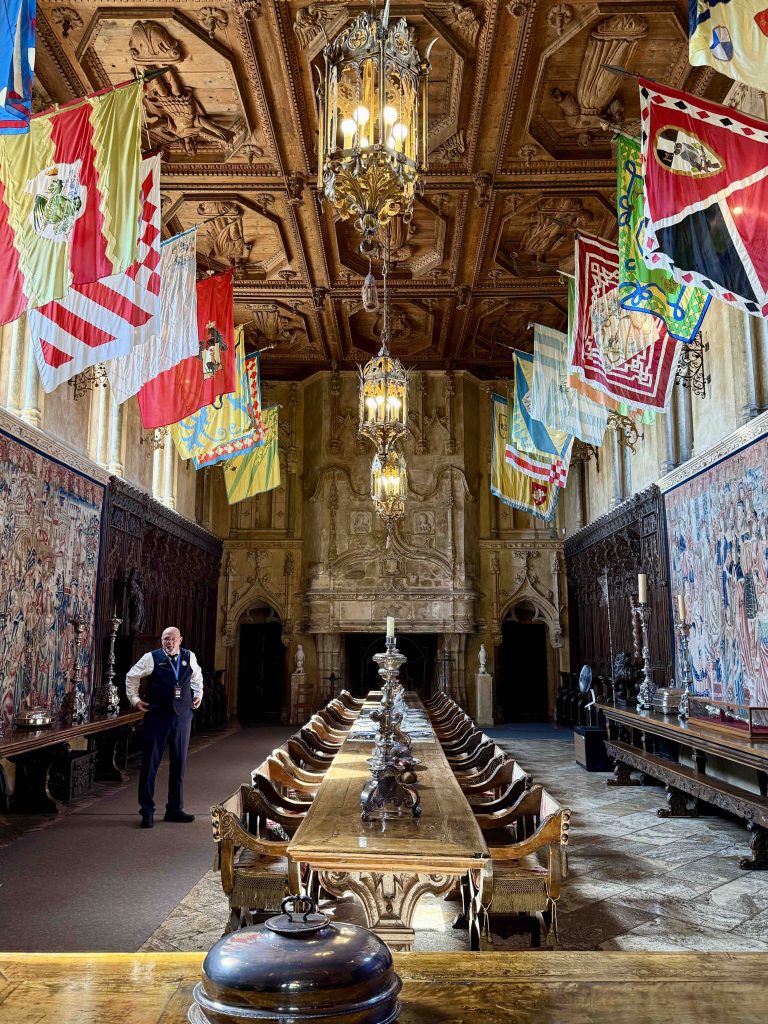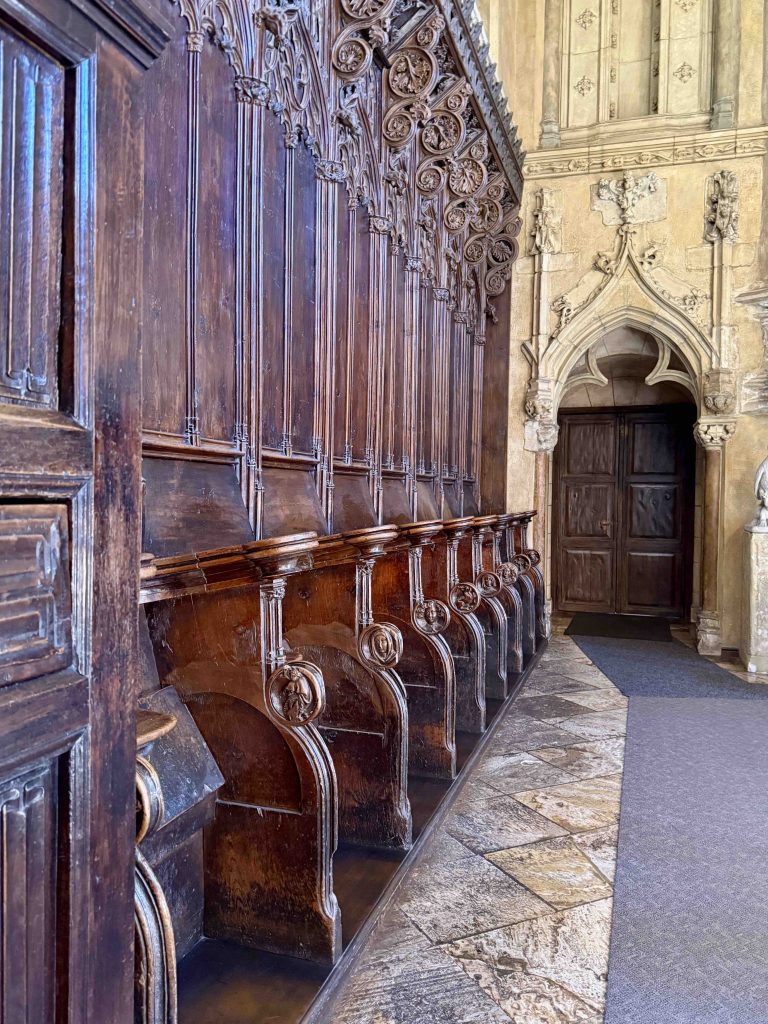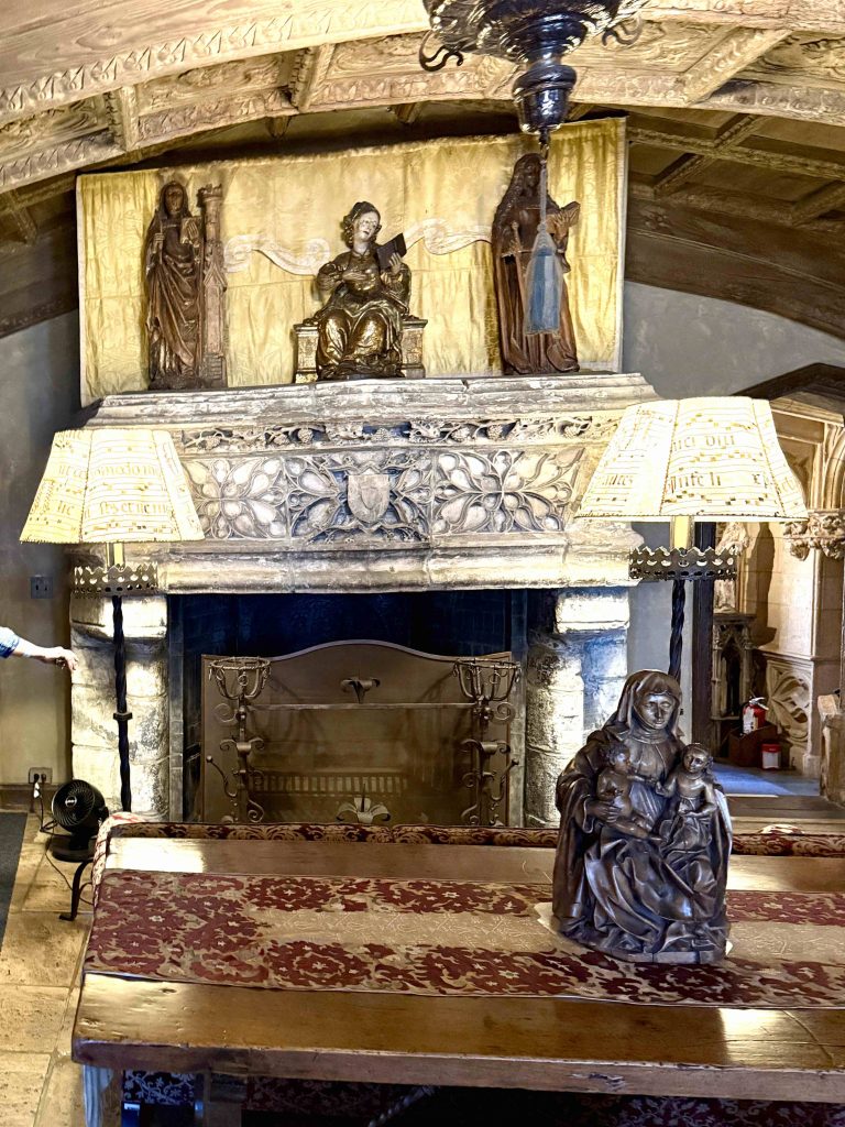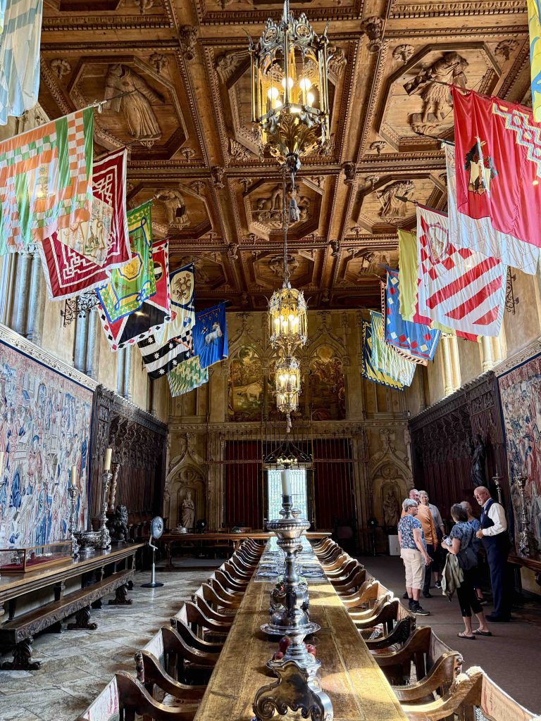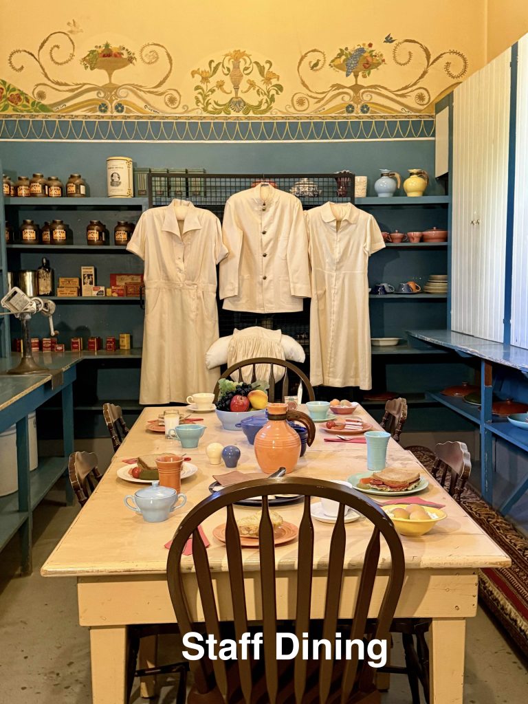 We were led to the Refectory, where guests were wined and dined, and subsequently to the kitchen. We learned from our docent that the strange-looking chairs along the Refectory walls were called “mercy seats,” which allowed serving staff a leaning respite during lengthy meal events. There was also a dining area in the kitchen for staff, which reminded us of “Downton Abbey” scenes of the help eating together. I wondered if William required the staff to wear uniforms, until I saw examples hanging above the staff dining table.