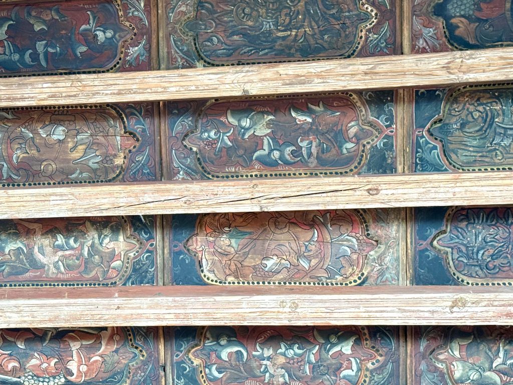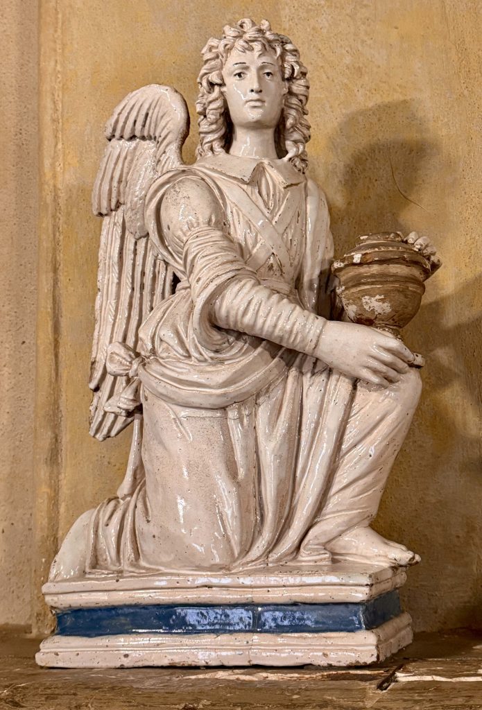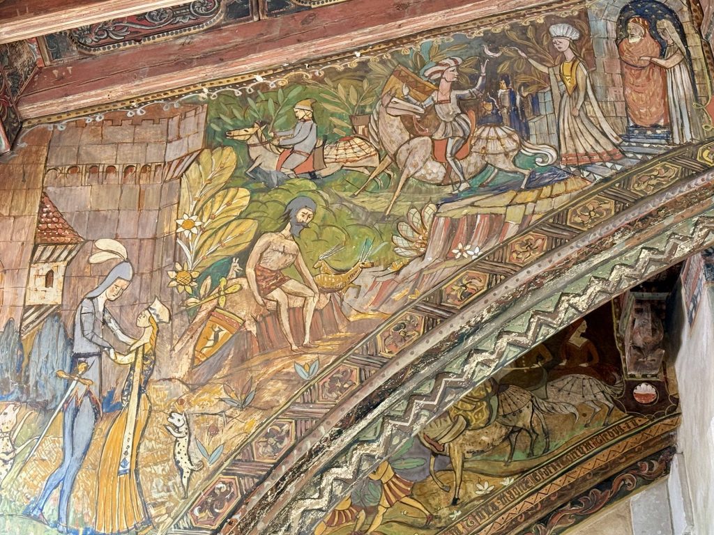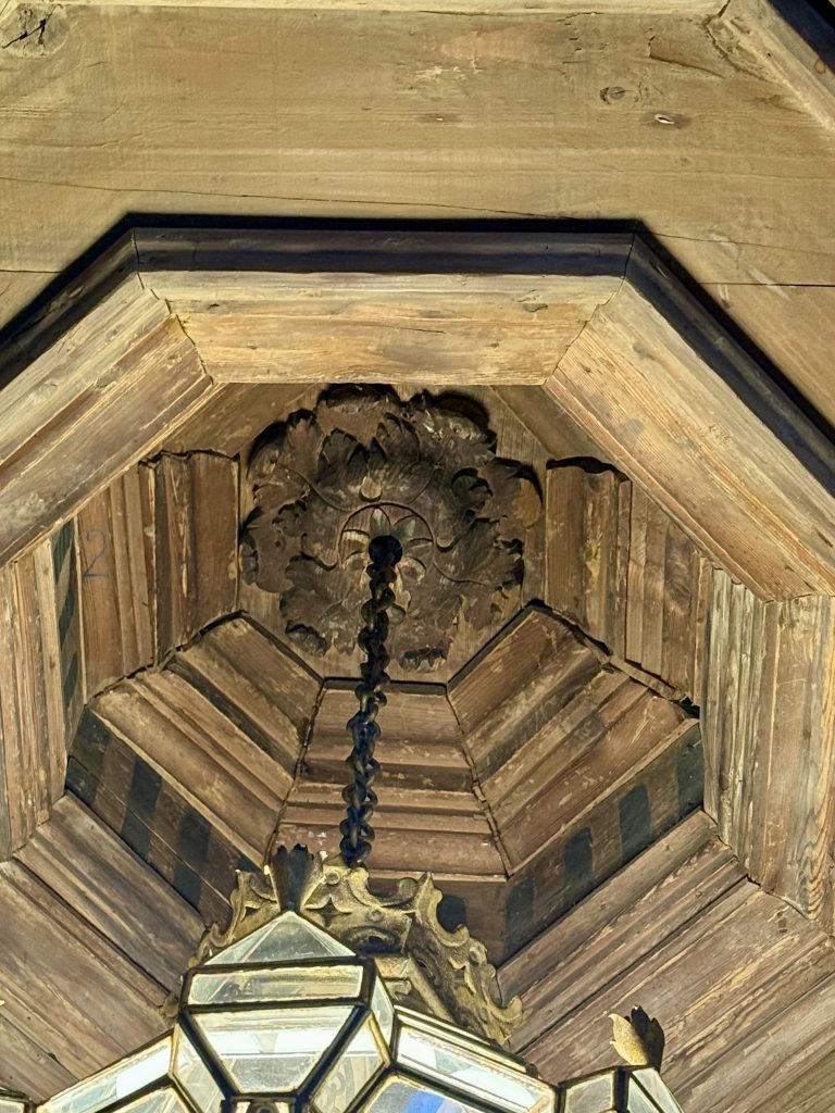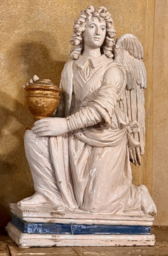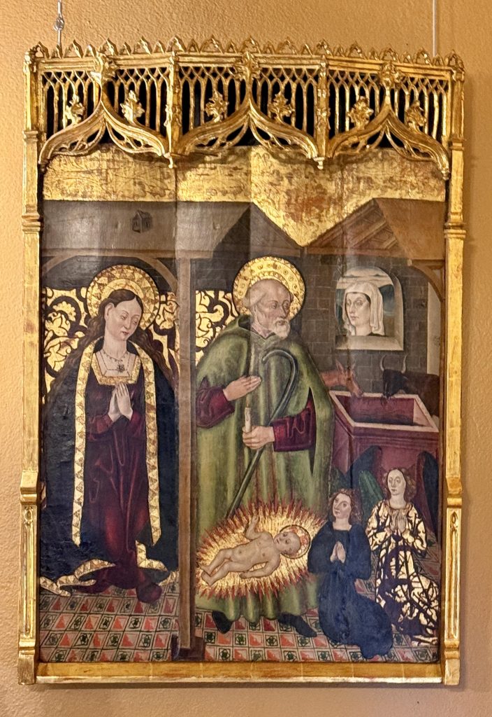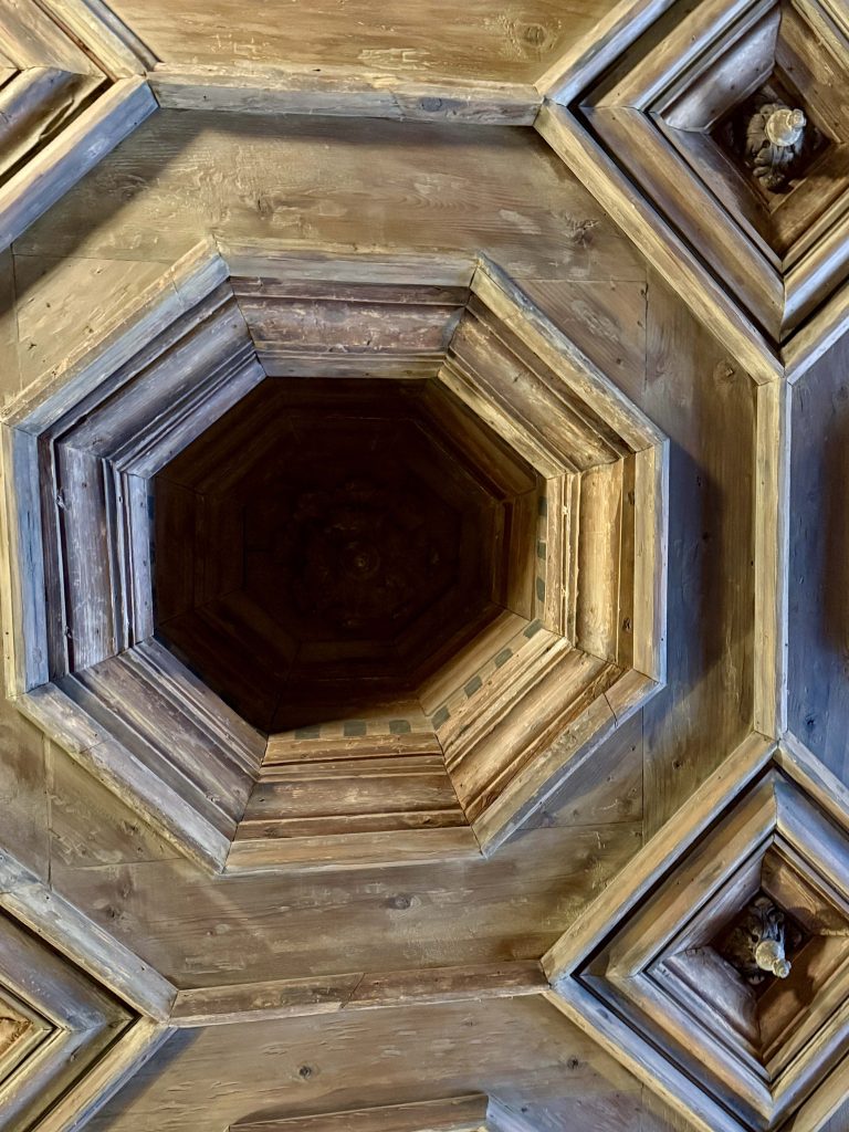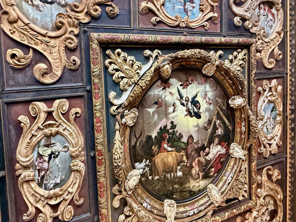 We were led to the Refectory, where guests were wined and dined, and subsequently to the kitchen. We learned from our docent that the strange-looking chairs along the Refectory walls were called “mercy seats,” which allowed serving staff a leaning respite during lengthy meal events. There was also a dining area in the kitchen for staff, which reminded us of “Downton Abbey” scenes of the help eating together. I wondered if William required the staff to wear uniforms, until I saw examples hanging above the staff dining table.