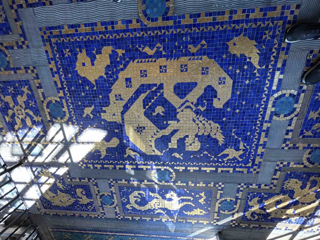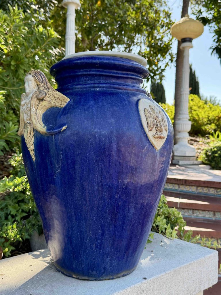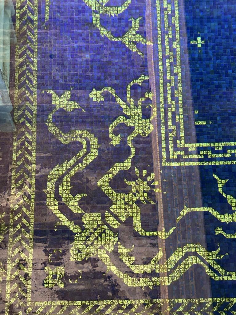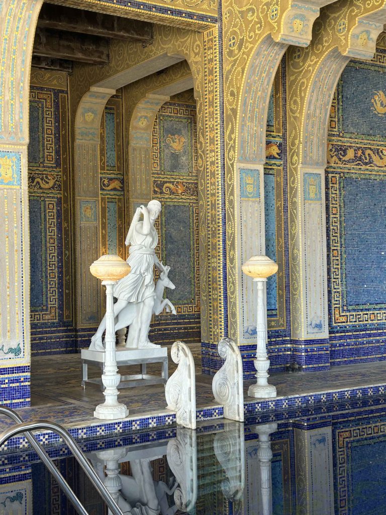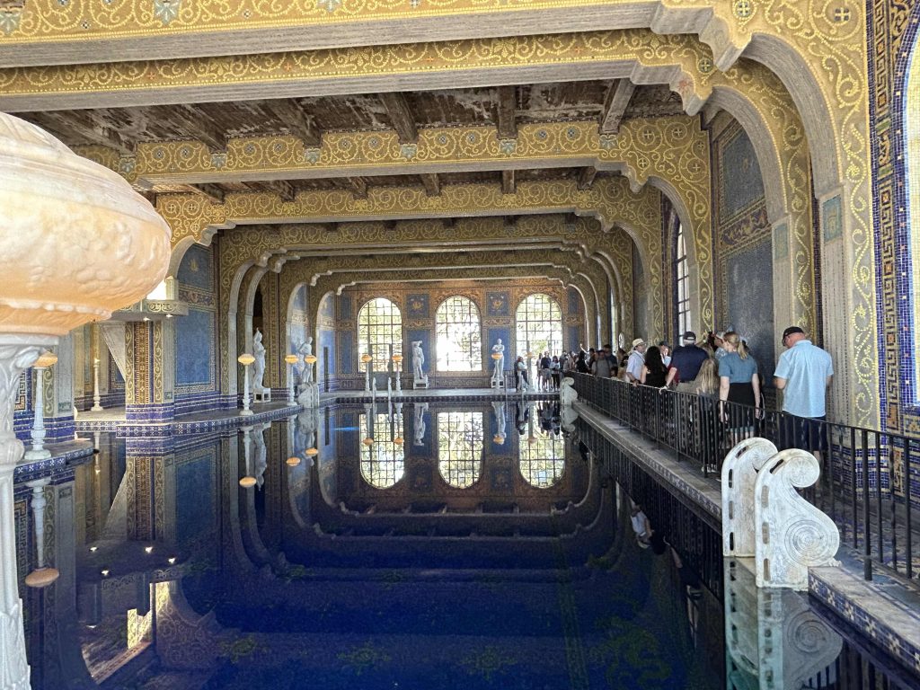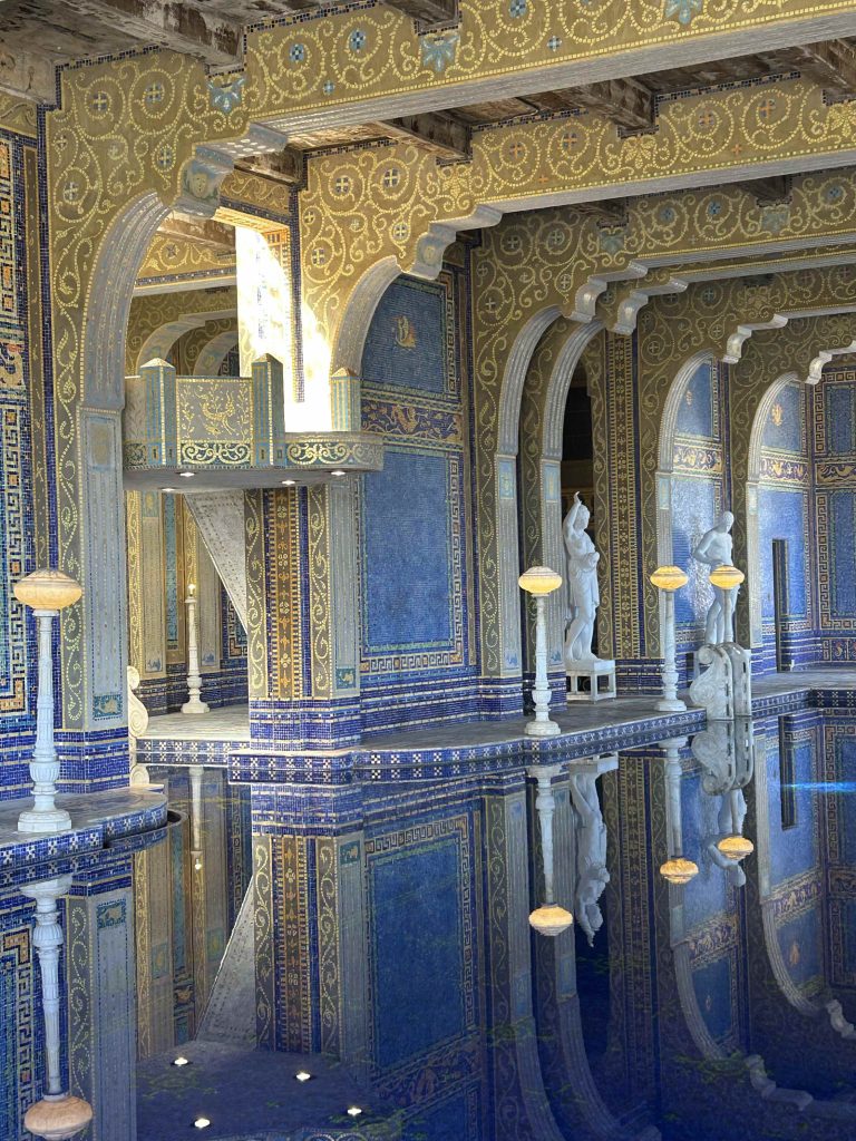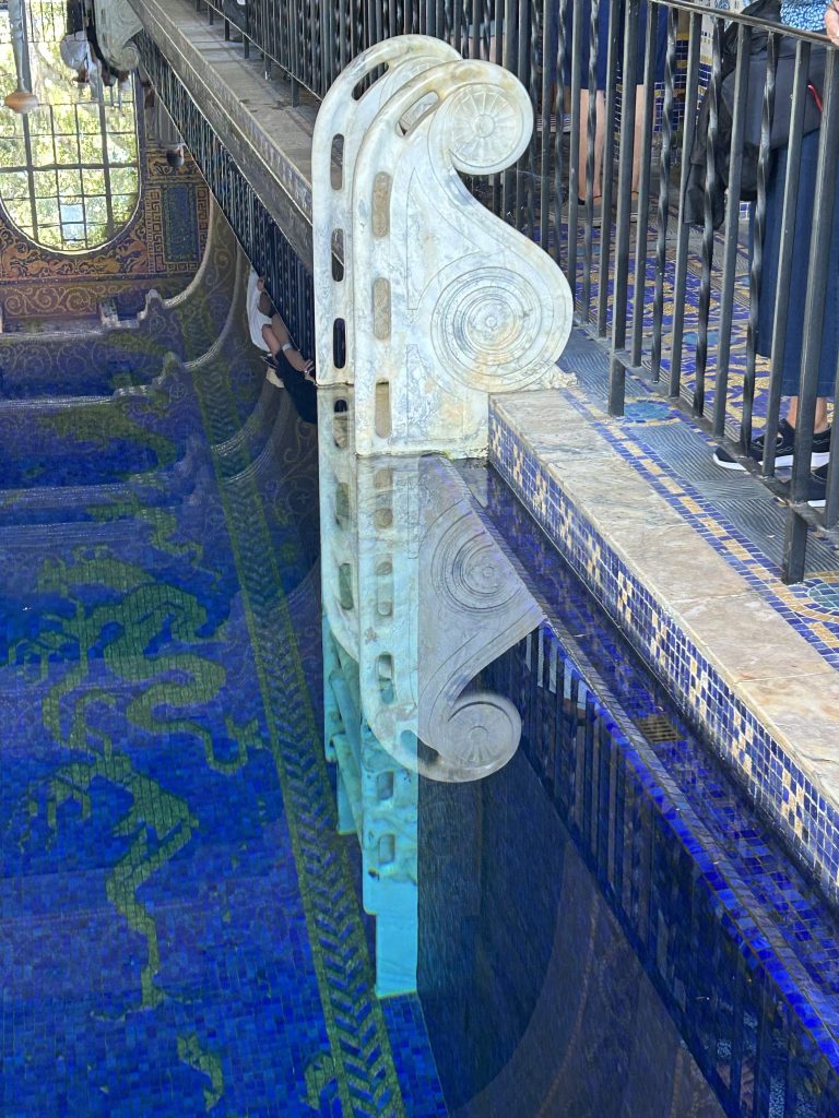 We left Casa Grande, passed the tennis courts, and ended our tour at the extravagant indoor Roman Pool built beneath the courts. The pool design was inspired by the Baths of Caracalla in Rome and the incredible tile work was patterned after the 5th Century Mausoleum of Galla Placidia in Ravenna, Italy. It took nearly 2 million, handmade 1-inch square glass tiles colored with blues, orange and gold leaf to complete the pool. The shimmering effects created by the tile mosaics in the pool, on the deck, and up the walls were stunning.