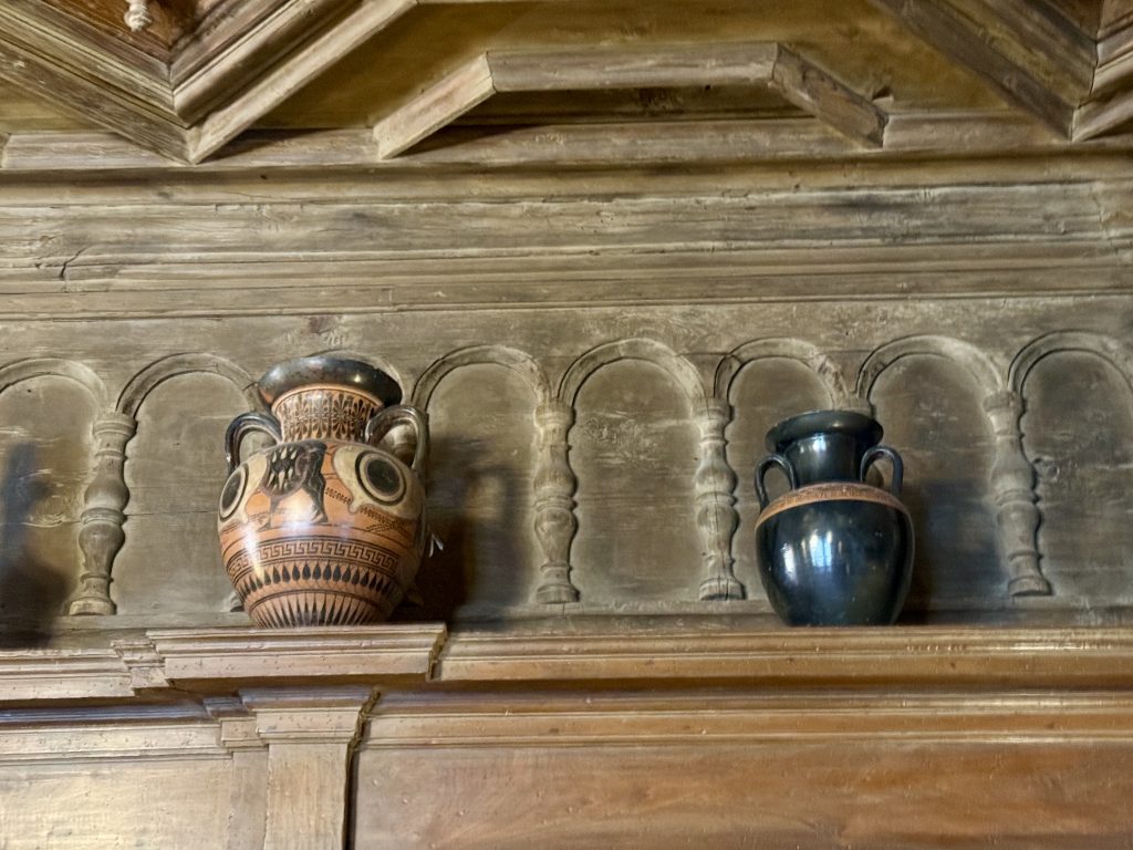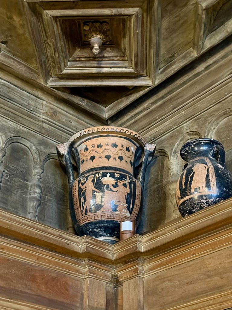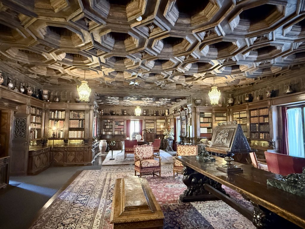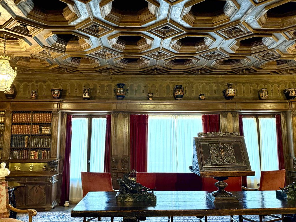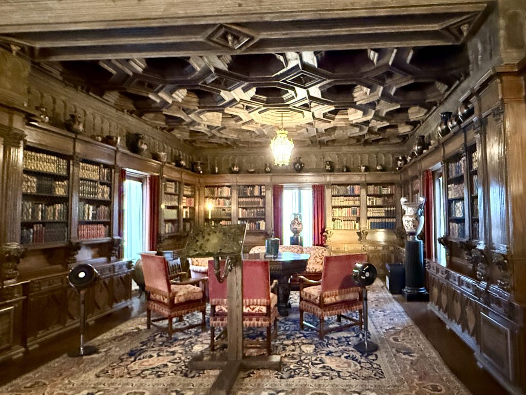 Silly us. The library was unmistakable at 80 feet long, held over 4,000 books, and displayed 150 Greek vases among many other interesting details, such as hand-painted wood trim.
