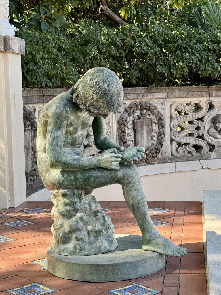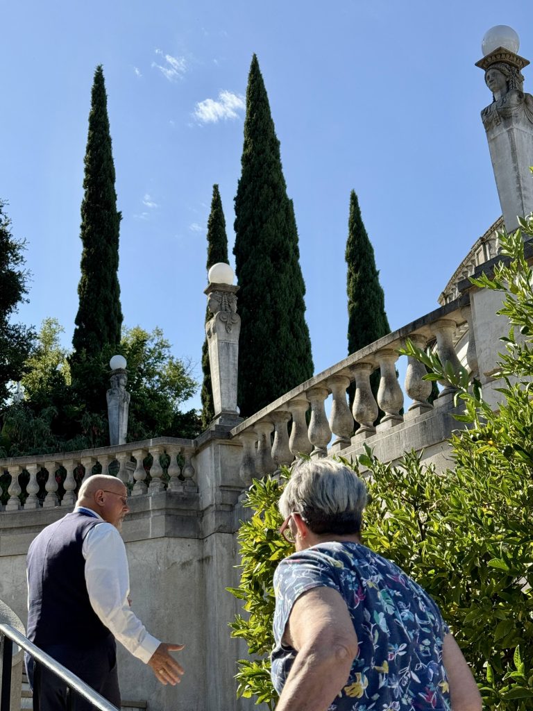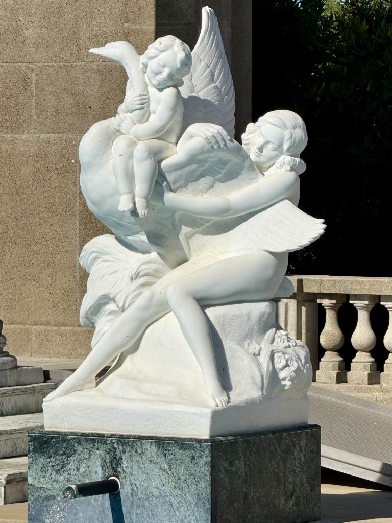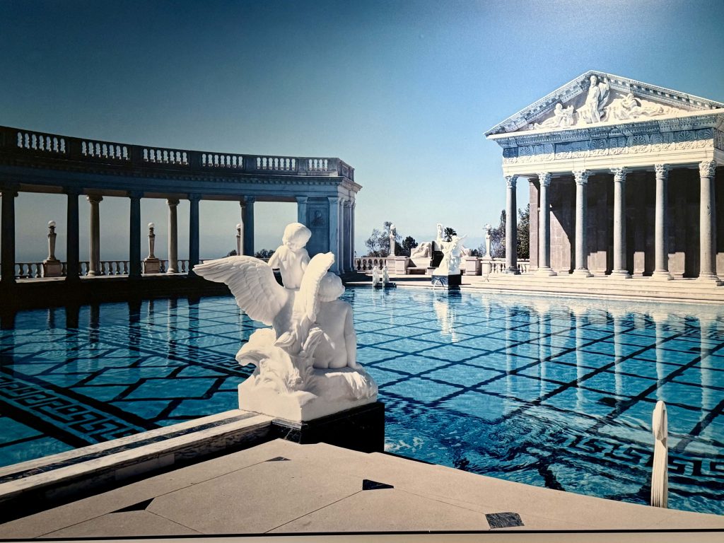 We took a 3-mile bus ride narrated by Alex Trebek from the Visitor Center to the tour-drop off point just below the North Terrace. Our docent was waiting for us and immediately escorted us up a stairway to the Neptune Pool. He gave us a flavor of what kind of client William was for both his architect and construction manger, by relating that the pool we saw was built three times before William was close to being satisfied. It was never fully finished because of William’s persistent design changes and the financial difficulties he experienced between the 1930’s depression and WW II.
