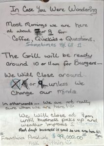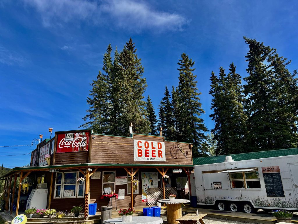Prior to leaving Carmacks, we drove to the north edge of town to check out the eats at a food truck and liquor store we’d passed on our way in to town the day before. The signs on both facilities read OPEN; however, the food truck wasn’t serving yet, and the liquor store was opened only upon request. We did need some wine, so they opened for us. The whole situation had a weird vibe about it. I thought this hand-written sign hanging near the door explained the experience perfectly.