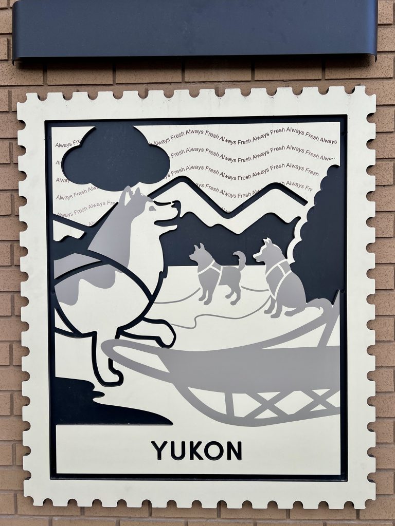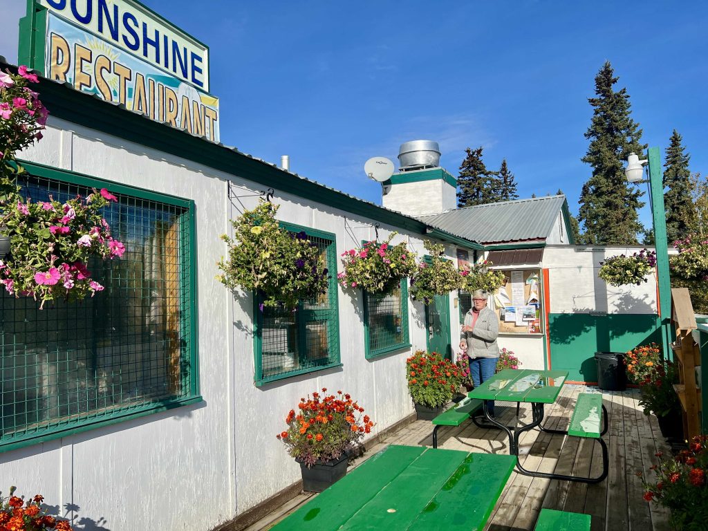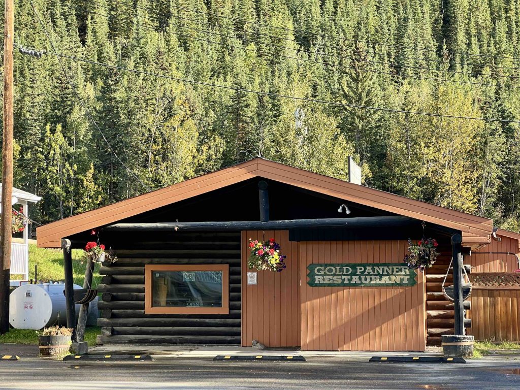 That first evening, we walked across the hotel parking lot to have dinner and a glass of wine at the Gold Panner Restaurant. Neither the food nor the wine were particular remarkable, but the place was clean, the service was good, and we were two of only five diners. The wall finish was the inner side of the logs used to construct the building. Over the years, visiting occupants from across the world had carved their names and all manner of other graffiti into the exosed logs. This made for interesting reading and conversation, but we left no trace of our having been there. On the morning we hit the road, we ate a big breakfast at the Sunshine Restaurant (and Post Office). In general, we’ve found it’s hard to ruin a basic breakfast meal, and this place confirmed our experience.