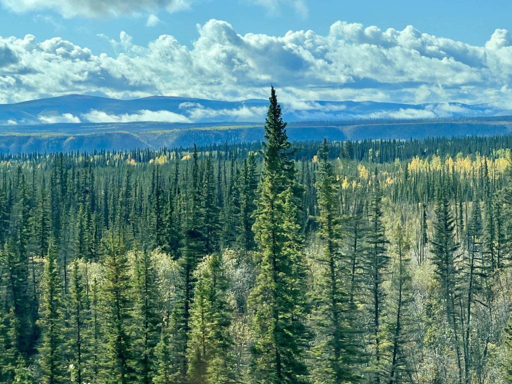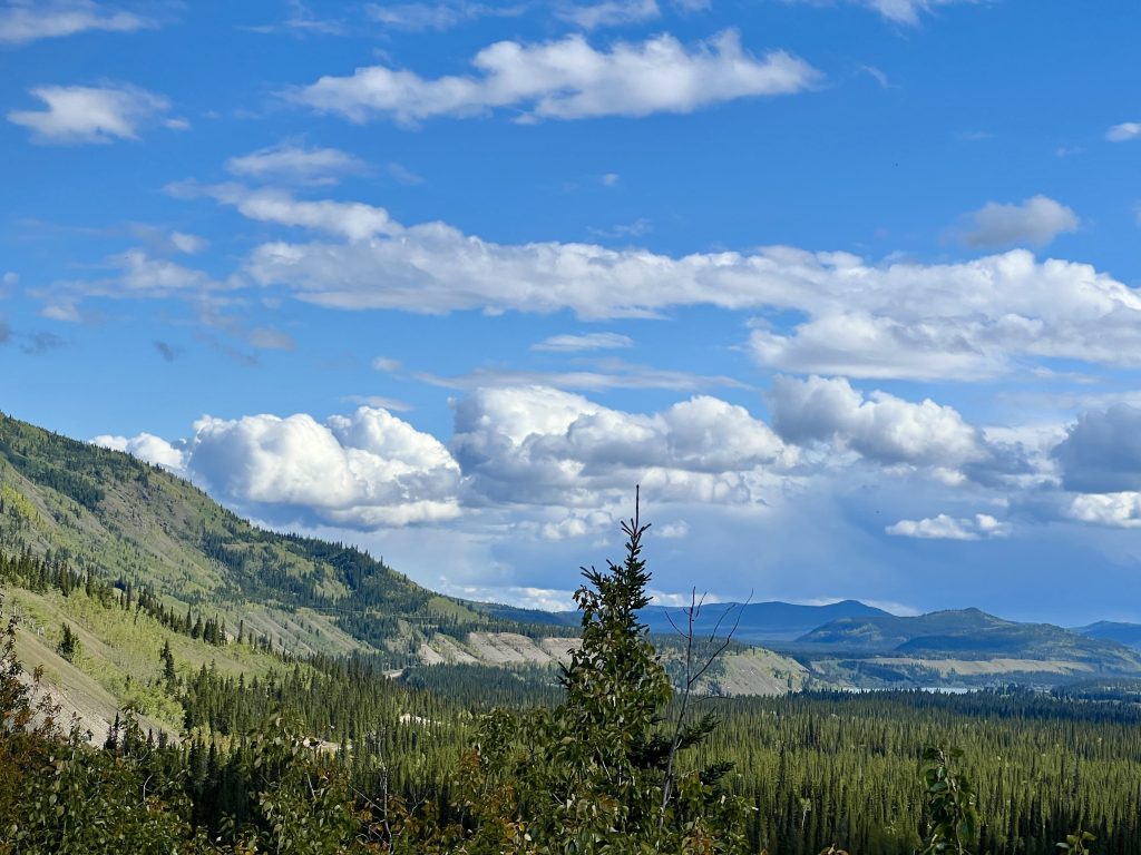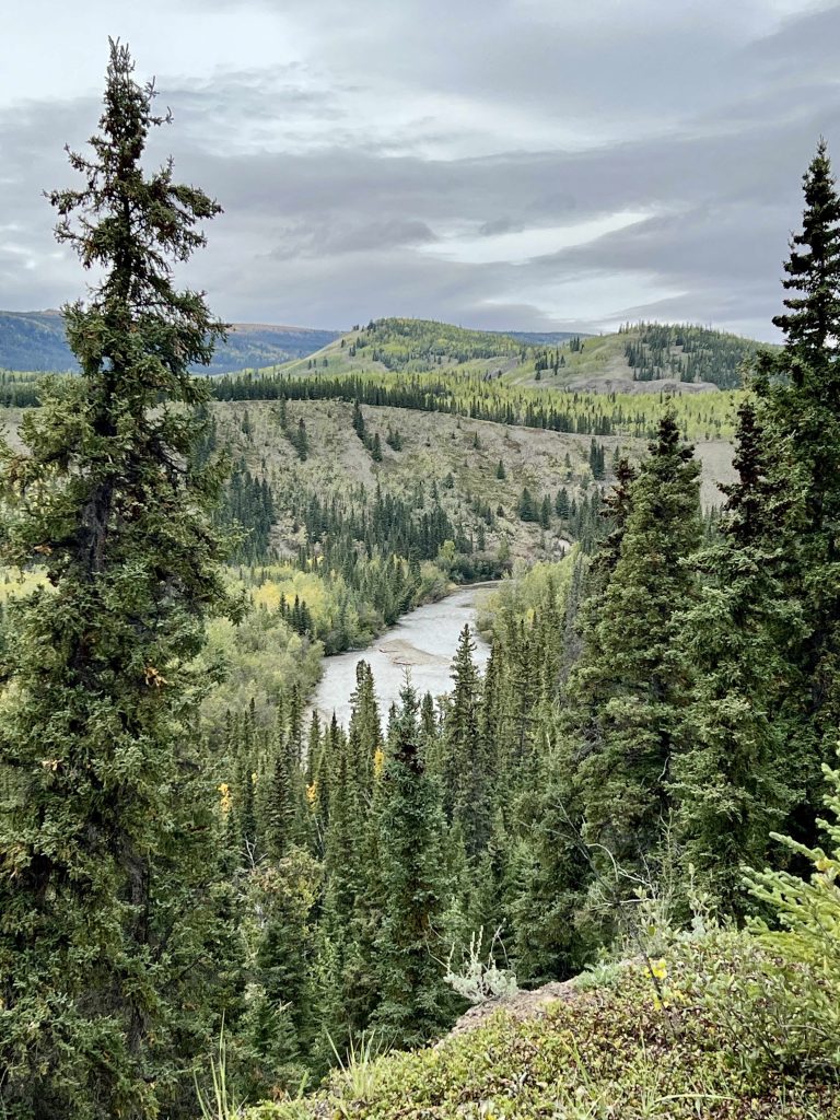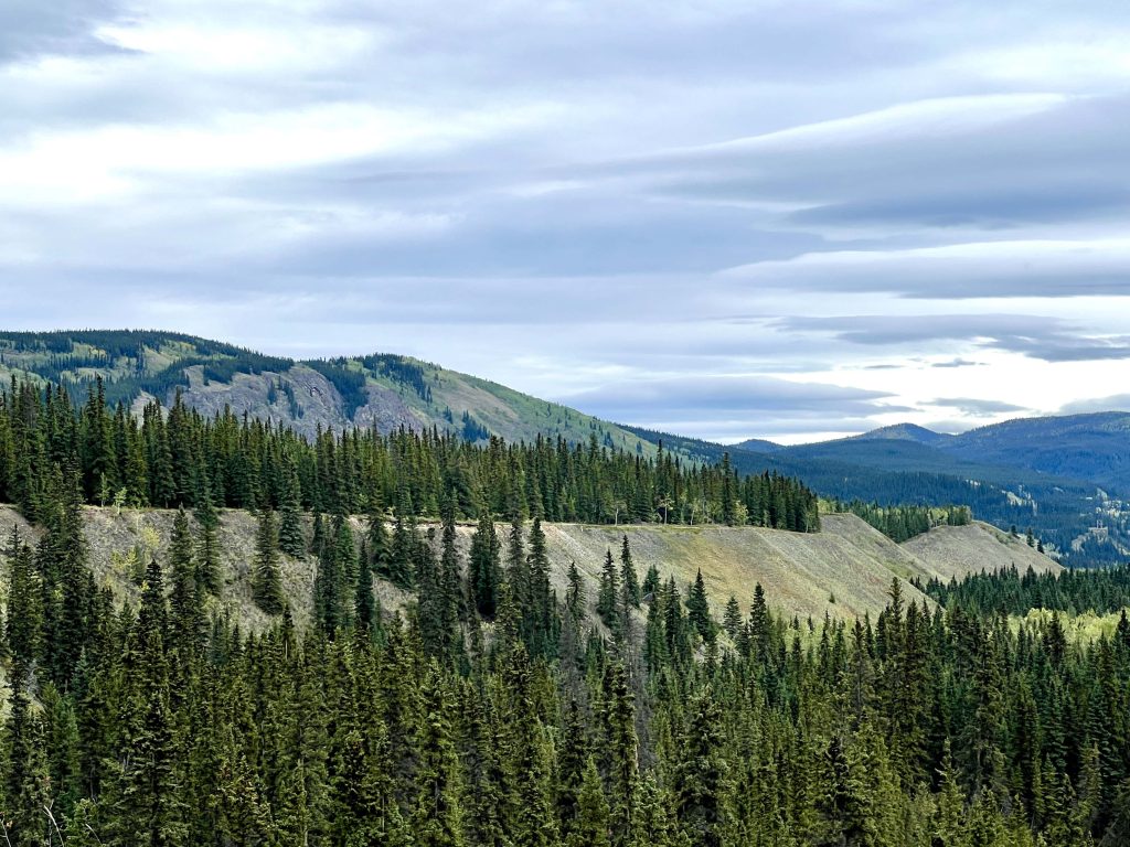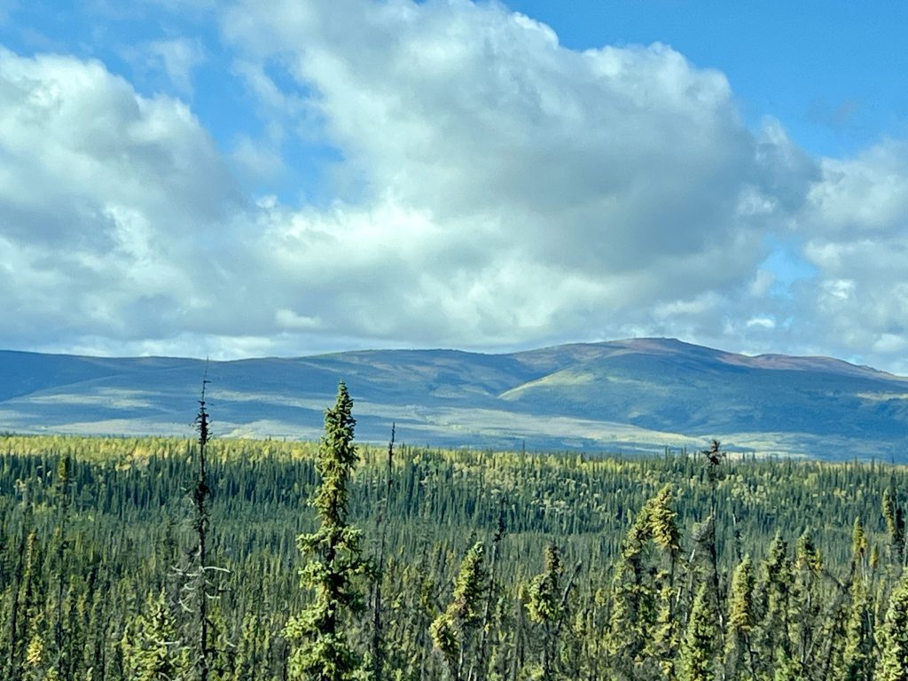 It was 222 miles to Carmacks. Most of the roadway passed through thick boreal forests carpeting the rolling hills, mountains, and Yukon River Valley. The weather was partly sunny, which made for some great pictures. We also enjoyed seeing a little autumn color in the leaves on the deciduous trees.