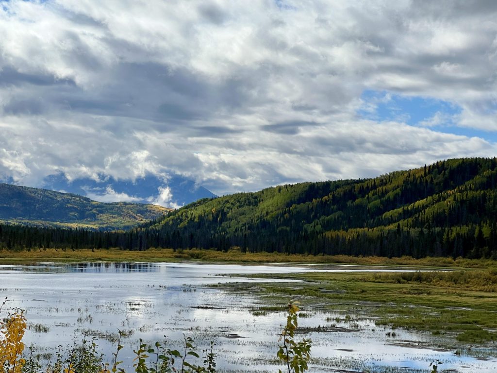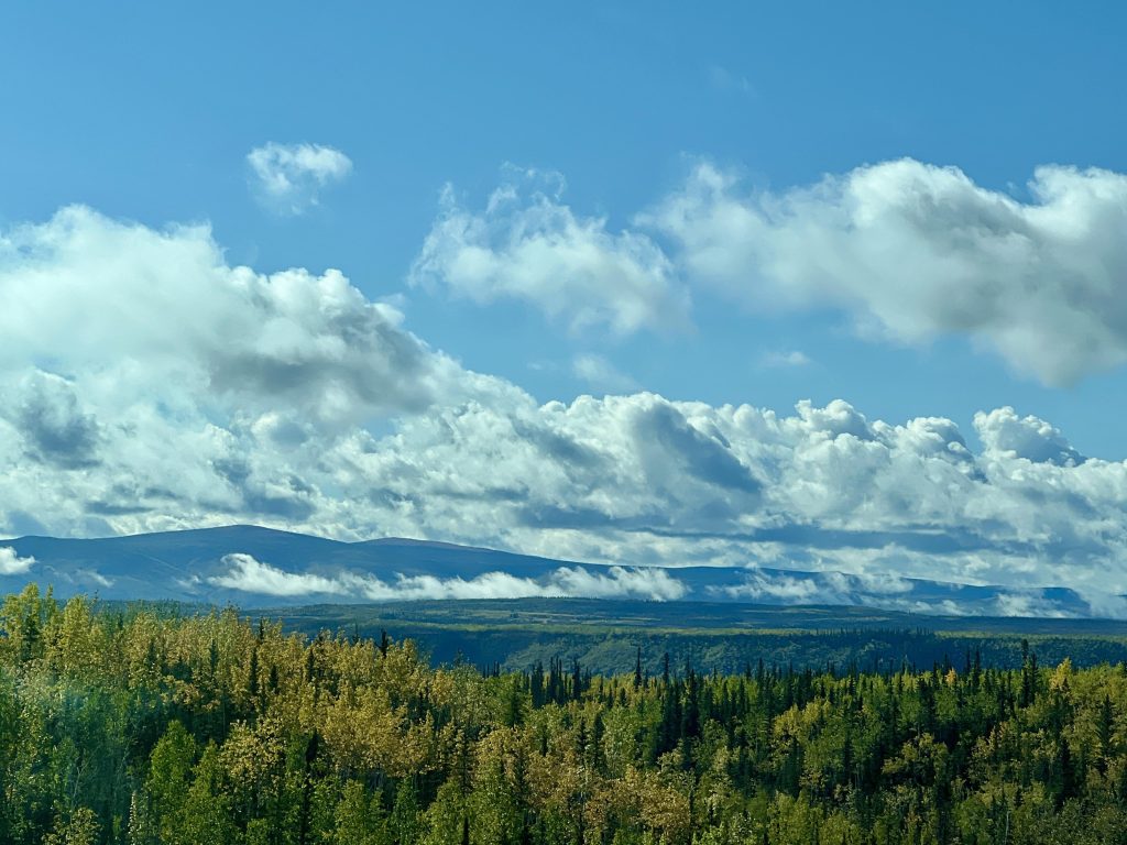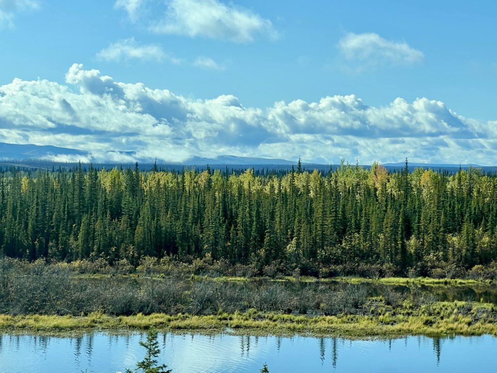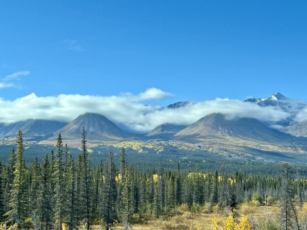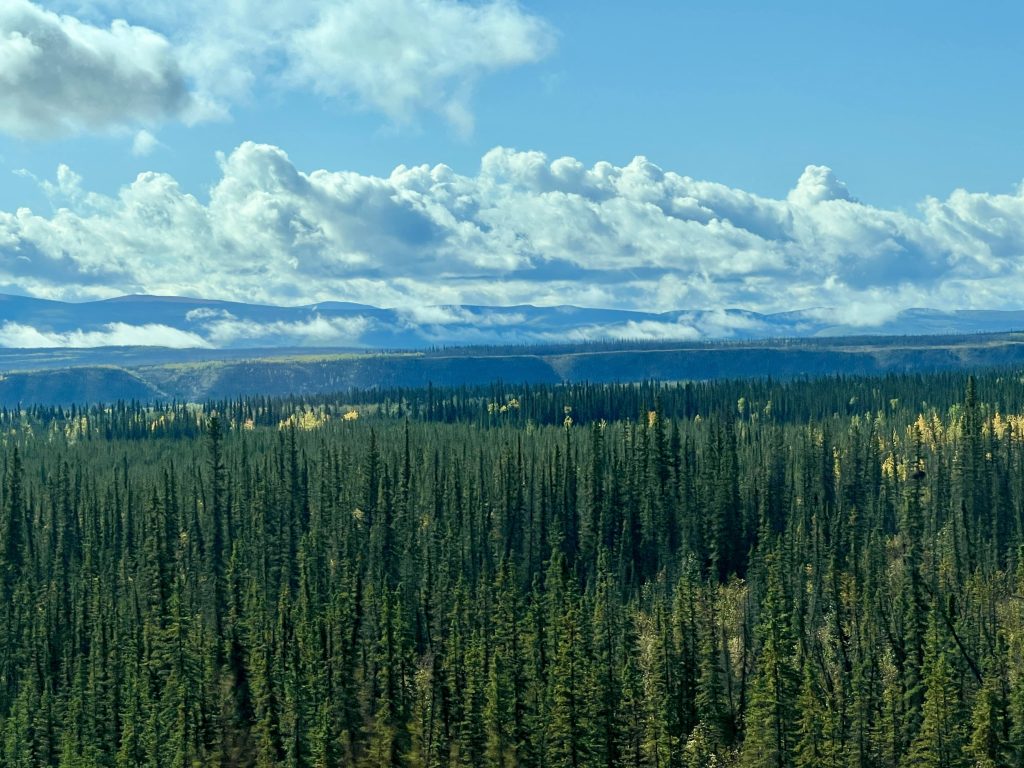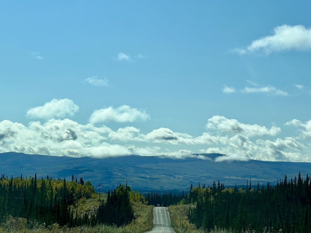 It was 222 miles to Carmacks. Most of the roadway passed through thick boreal forests carpeting the rolling hills, mountains, and Yukon River Valley. The weather was partly sunny, which made for some great pictures. We also enjoyed seeing a little autumn color in the leaves on the deciduous trees.
